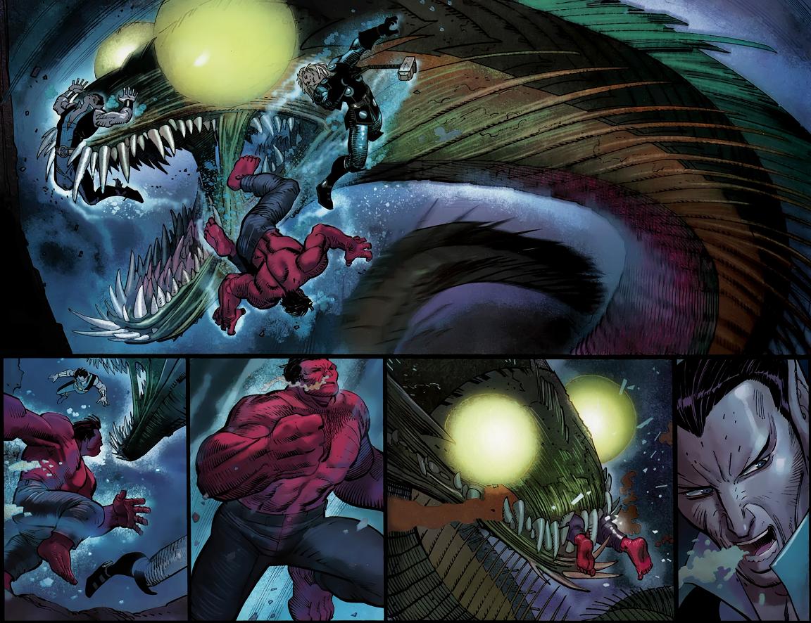 3つのGemを手に入れたThe Hoodと対峙するThor, Red Hulk, Namor。