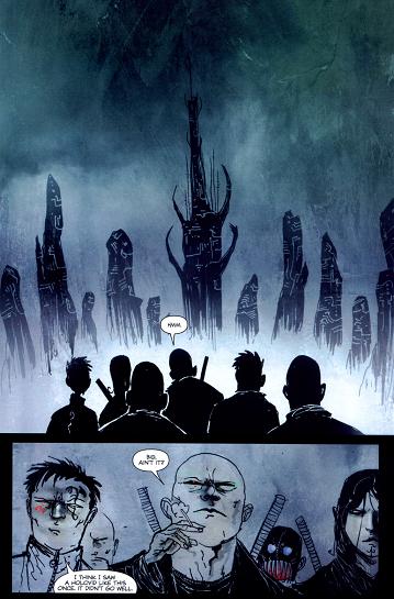 Doug Ramsey(Cypher)の墓に現れたEli Bard, Wither, Caliban。Eli Bardの腕とCalibanの腕と脚にMagusの模様が。