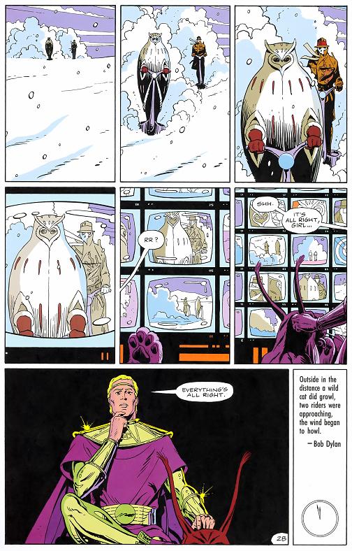 その後、世界平和が実現し、社会は日常を取り戻していた。母と和解したJuspeczykは、Dreibergと二人で再びヒーロー活動を始める決心を固める。そして右翼雑誌『ニュー・フロンティアーズマン』誌の編集者は、編集長から穴埋め記事を作るように言われ、クランク・ファイルに手を伸ばす。実は南極でVeidtと対峙する前に、Kovacsは彼の抱いた疑惑を日記にまとめ、愛読していた『ニュー・フロンティアーズマン』誌に投稿していたのだ。その編集者はKovacsの日記を使うべきかどうか迷っており、編集長から恫喝され、「後はお前に任せたからな」という台詞で物語は終わる。