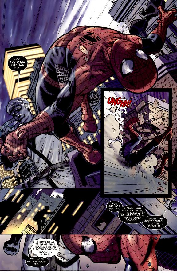 Shadowlandから一時撤退し、Master IzoやPunisherも交えたミーティングの最中(Shadowland #3)、こっそり抜け出すSpider-Manと、それに気づき後を追うShang-Chi。Spider-Manは、Mister Negativeを見かけたため抜け出したのだった。現場に戻ってみると、Mister Negative率いるDemon軍団と忍者たちの戦いが始まっていた…。