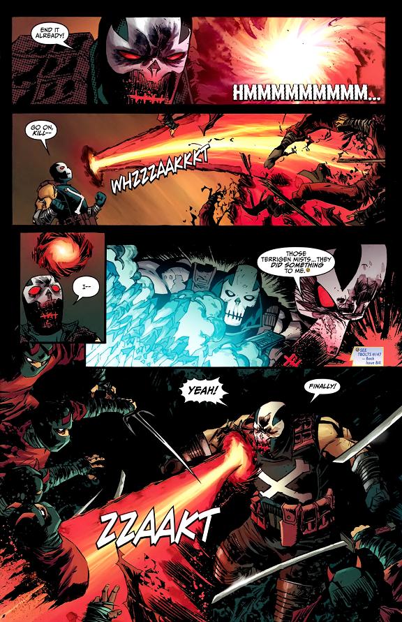 MoonstoneとJuggernautが大群を相手にし、GhostとCrossbonesがKimbroを助け出すという二手に別れる作戦を取るThunderbolts。