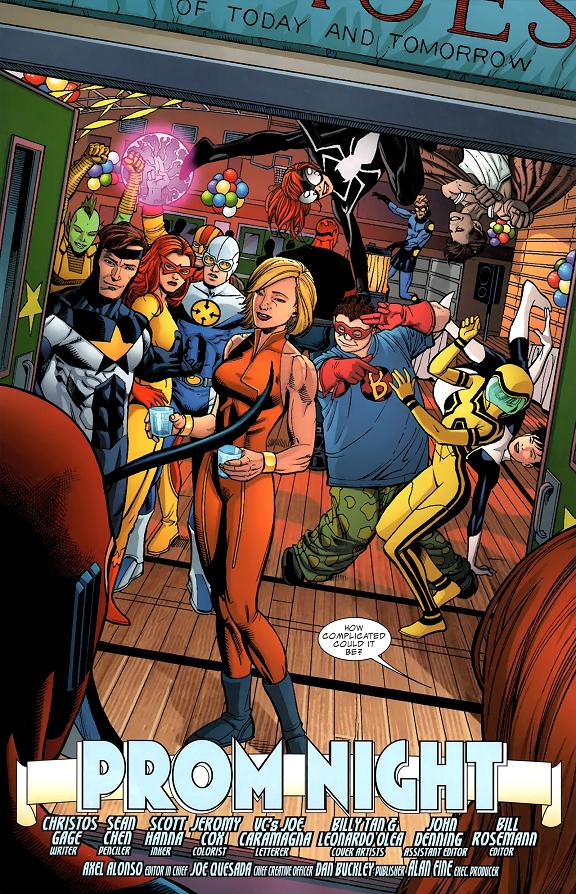 Academyでのパーティ。参加者は、教師のGiant-Man, Tigra, Speedball, Justice、生徒のFinesse, Hazmat, Mettle, Reptil, Striker, Veil、他からKomodo, Hardball, Butterball, Firestar, Ultragirl, Spider-Girl, Nomad。スーパーヒーローだって感情はある。みんなが集まれば、恋愛もあり、喧嘩もある…。