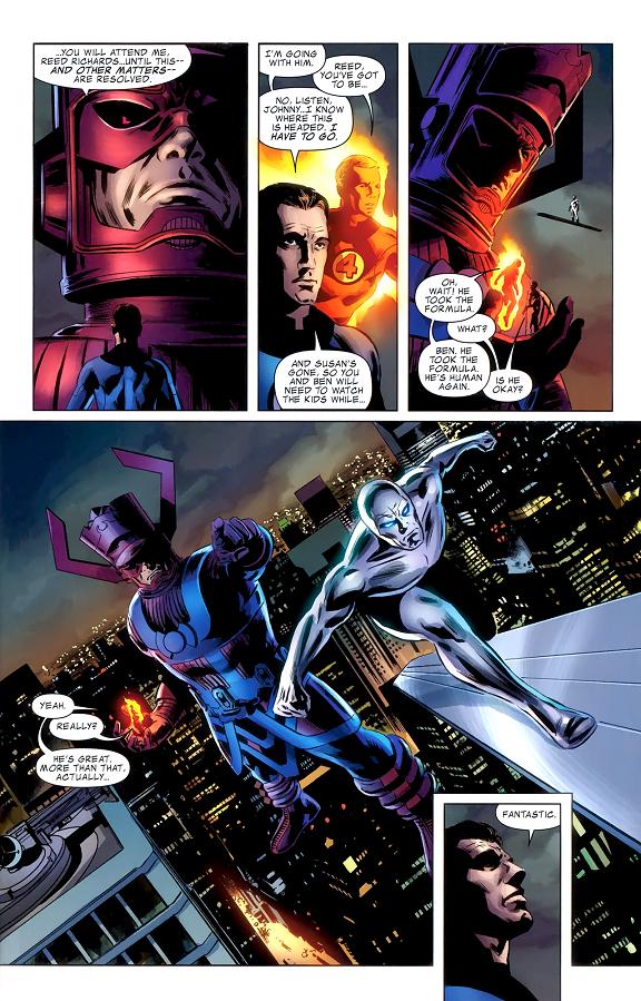 Valeriaたちにもらった薬を飲み、一時的に人間の姿に戻ったBen(Thing)。Johnnyと共に街に繰り出し、普通の人としての楽しみを満喫する。一日中遊び通し満足して帰宅するが、Buxter Bildingの上に立ちはだかるGalactusを見て、二人は凍りつくのだった…。