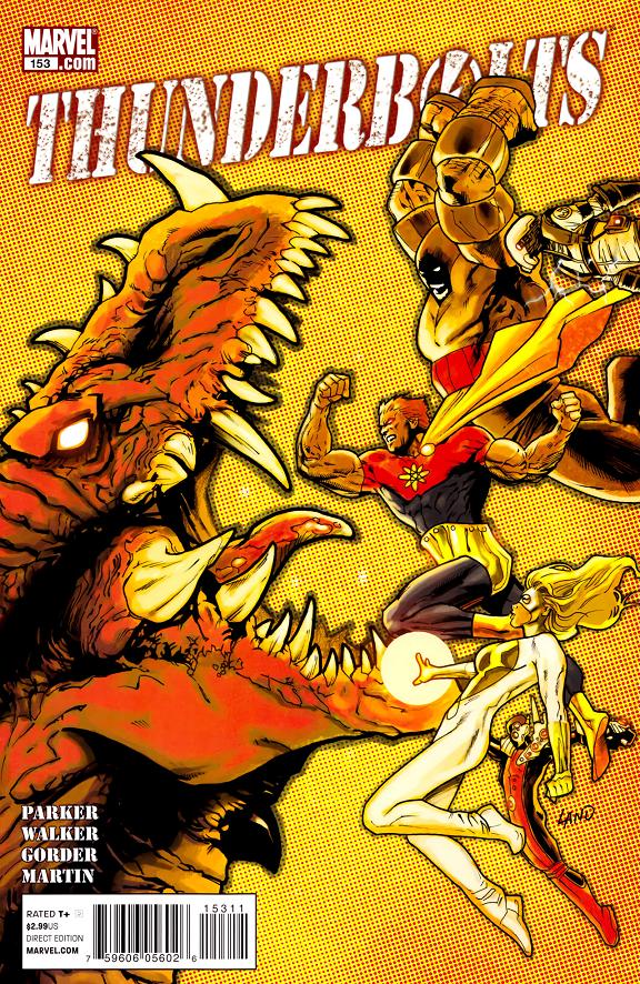 恐竜たち4体と戦うThunderbolts(Luke, Moonstone, Songbird, Juggernaut, Man-Thing, Mach V, Ghost, Hyperion)。