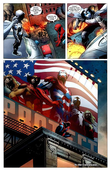 立ち去るMoon Knight。Dark Avengersの大きな看板の前で項垂れるSpider-Man…。
