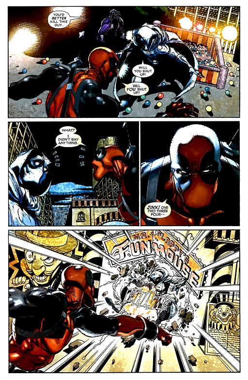 病院で患者を殺害しようとしているDeadpoolを間一髪で阻止したMoon Knight。Deadpoolは、夫と娘を殺された女性の依頼で来ていたのだった。本当の正義とは何か。迷うMonn Knightは、再びDeadpoolと出くわすことになるが…。